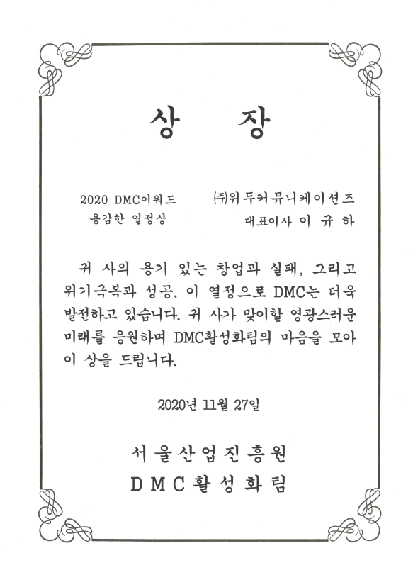 2020 서울산업진흥원 2020 DMC어워드 페이지 정보 작성자 WeDu 댓글 0건 조회 4,624회 작성일 21-12-31 12:57 본문 2020-11-27 2020 DMC어워드 용감한 열정상 서울산업진흥원 DMC활성화팀 List Previous2020 기술혁신 우수기업 21.12.31 Next2018 소년한국 우수 어린이 도서 19.05.30