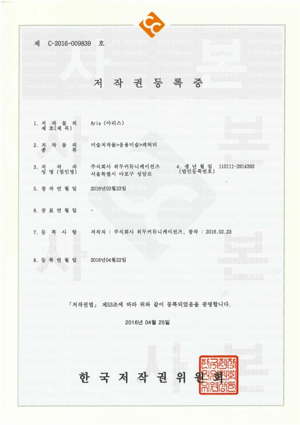 [한국/저작권] 아리스 페이지 정보 작성자 WeDu 댓글 0건 조회 5,232회 작성일 19-05-30 19:09 본문 2016-04-22 저작권 C-2016-009839 아리스 / 미술저작물>응용미술>캐릭터 List Previous[한국/저작권] 필립 19.05.30 Next[한국/저작권] 리안 19.05.30
