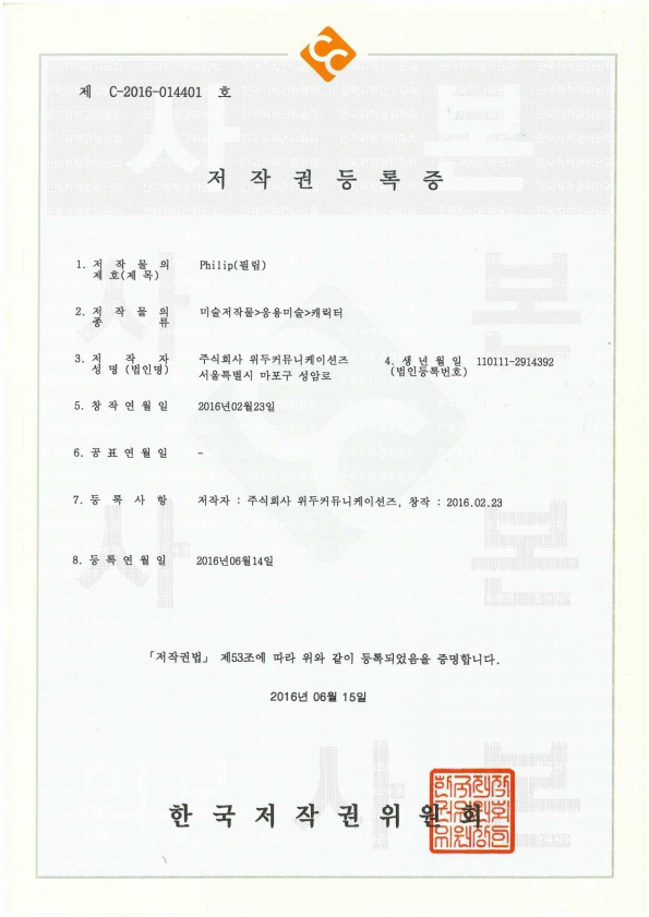 [한국/저작권] 필립 페이지 정보 작성자 WeDu 댓글 0건 조회 4,944회 작성일 19-05-30 19:09 본문 2016-06-14 저작권 C-2016-014401 필립 / 미술저작물>응용미술>캐릭터 List Previous[한국/저작권] 월터 19.05.30 Next[한국/저작권] 아리스 19.05.30