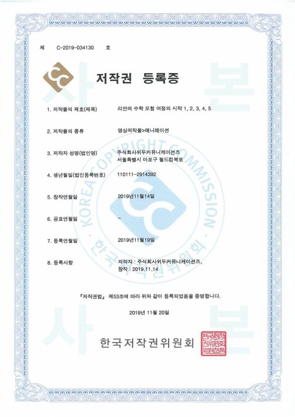 [한국/저작권] 리안의 수학 모험 여정의 시작 1,2,3,4,5 페이지 정보 작성자 WeDu 댓글 0건 조회 4,833회 작성일 21-12-31 12:36 본문 2019-11-20 저작권 C-2019-034130 영상저작물>애니메이션 List Previous[한국/저작권] OLL KIDS/MATH 21.12.31 Next[한국/저작권] 리안의 수학 모험 애니메이션 OST 19.11.25