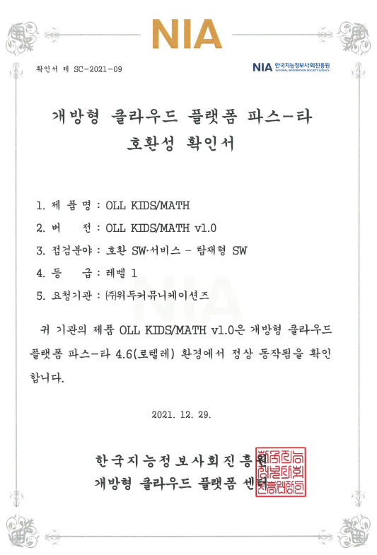 [한국/확인서] OLL KIDS/MATH 파스-타 호환성 확인서 페이지 정보 작성자 WeDu 댓글 0건 조회 8,391회 작성일 21-12-31 12:48 본문 2021-12-29 확인서 제 SC-2021-09 점검분야 : 호환 SW서비스 - 탑재형 SW List Next[한국/인증서] OLL KIDS/MATH 클라우드 서비스 확인서 21.12.31