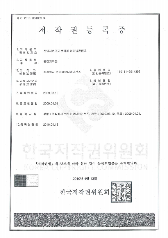 [한국/저작권] 신입사원조기전력화 이러닝 콘텐츠 페이지 정보 작성자 WeDu 댓글 0건 조회 5,047회 작성일 19-05-30 19:01 본문 2010-04-13 저작권 C-2010-004069 신입사원조기전력화 이러닝콘텐츠 / 편집저작물 List Previous[한국/저작권] 리안의 수학 모험 19.05.30 Next[한국/상표] OLL 41류 19.05.30